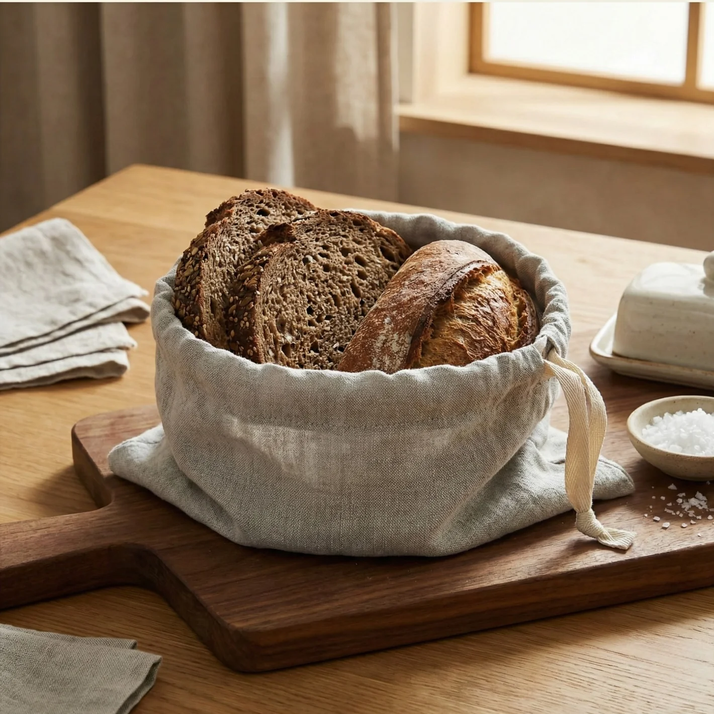 Unser Brotbeutel kombiniert atmungsaktive Naturfasern mit einer feinen Bienenwachs-Schicht. So bleibt die Kruste knusprig, innen bleibt’s saftig – ohne Plastik und ohne „Schwitzen“. Weniger Verschwendung, mehr Genuss – Tag für Tag.